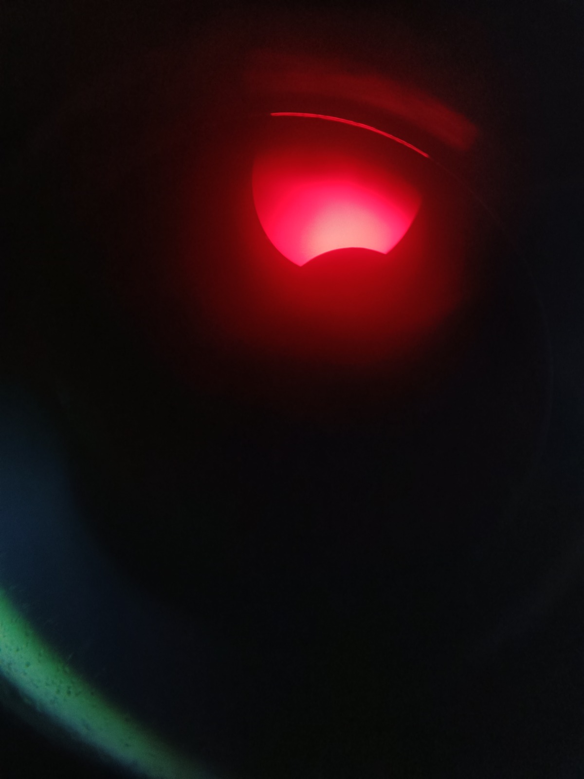 Durch das H-Alpha Teleskop habe ich mir sehr schwer getan ein brauchbares Bild mit meinem Mobiltelefon zu machen. Aber wenn man genau schaut sieht man sogar andeutungsweise eine Protuberanz.